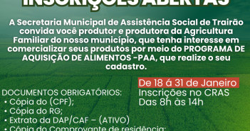A Secretaria Municipal de Assistência Social de Trairão convida você produtor e produtora da Agricultura…